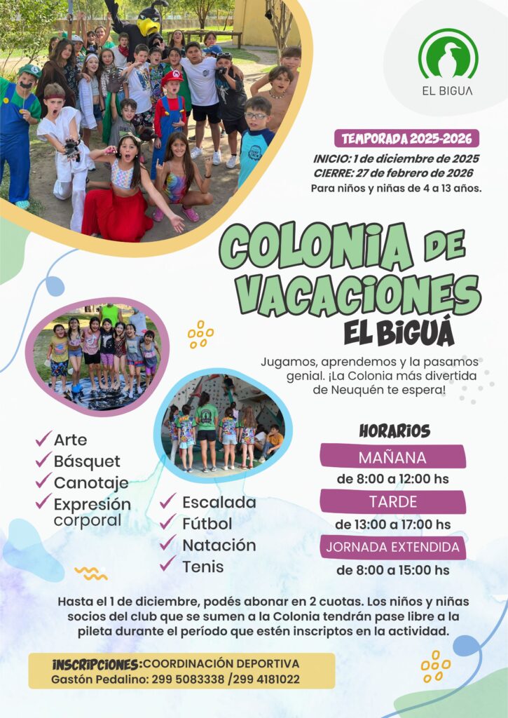 Para más información sobre La Colonia de Vacaciones de El Biguá, debés comunicarte de 9:00 a 20:00 hs con nuestra Coordinación Deportiva por Whatsapp al (0299) 155 083 338 o enviando un mail a coordinadordeportivo@elbiguaneuquen.com.ar. Debés llevar una fotocopia de DNI de la persona a inscribir.